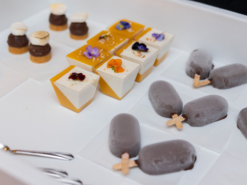 Passed Desserts on Hawker Trays Frozen S'mores (FIRE), Mini "Dove Bars," Two-Tone Mango-Coconut Panna Cotta Pops (WATER, EARTH)